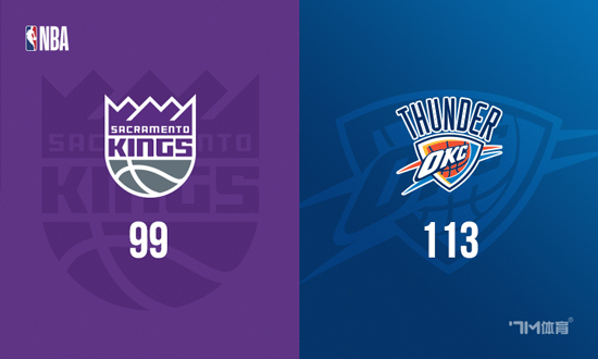 比赛开始,双方开场便陷入缠斗,比分交替领先,亚历山大连投带罚拿分,威少传射建功带队追赶,次节雷霆轮番冲击内线频频得手,国王多点开花还以颜色,切特高效输出,施罗德里突外投迅速回应,雷霆一波6-0以58-50领先结束上半场。易边再战,切特先中三分将分差拉开到两位数,此后两队围绕10分分差展开拉锯战,亚历山大延续火力,国王不断冲击努力追赶,末节多特突然发力,内外开花连续拿分帮助球队保持优势,国王大势已去无力回天。最终,雷霆113-99击败国王,主场过关。