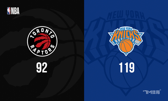 开场后猛龙打出7-0开局,尼克斯状态不佳接连出现失误,并且三分线外频频打铁,阿努诺比一度帮尼克斯追赶比分,但猛龙多点开花在第一节结束时将分差拉大到10分。第二节上来两队围绕10分拉锯,阿努诺比在攻防两端都有出色发挥帮助尼克斯在半场结束时追到只差4分。易边再战,刚上来两队还打的有来有回,第三节后半段猛龙进入轮换后突然进攻突然断电,阿努诺比和布里奇斯在将近8分钟时间里帮助球队打出一波27-4的高潮完成反超。最后一节猛龙依旧一蹶不振,场上分差来到20分以上,比赛失去悬念,最终尼克斯119-92逆转猛龙取得4连胜,猛龙4连胜被终结。
