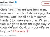 火箭在今天的比赛中输给森林狼,下半场全队只得到可怜的29分,最终被森林狼逆转,球队当家控卫保罗全场仅有5分7助攻3抢断进账,他的整体投篮只有8中1,还出现了5次失误。赛后保罗在接受采访时谈到自己今天的表现,他表示“我不清楚自己今天究竟有几个失误,我清楚的是我必须打得更好,当我们落后的时候不能把所有的重任放在哈登身上,我们必须用正确的方式去 …… …… [详细]